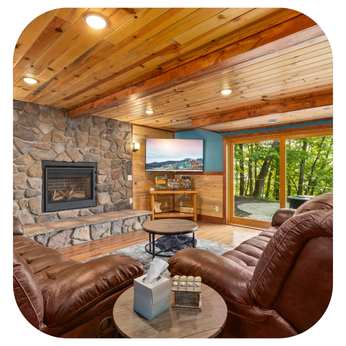 2 couches in lower level next to gas fireplace and TV. TV viewable from high-top table as well, so room for everyone to watch a show at the same time.