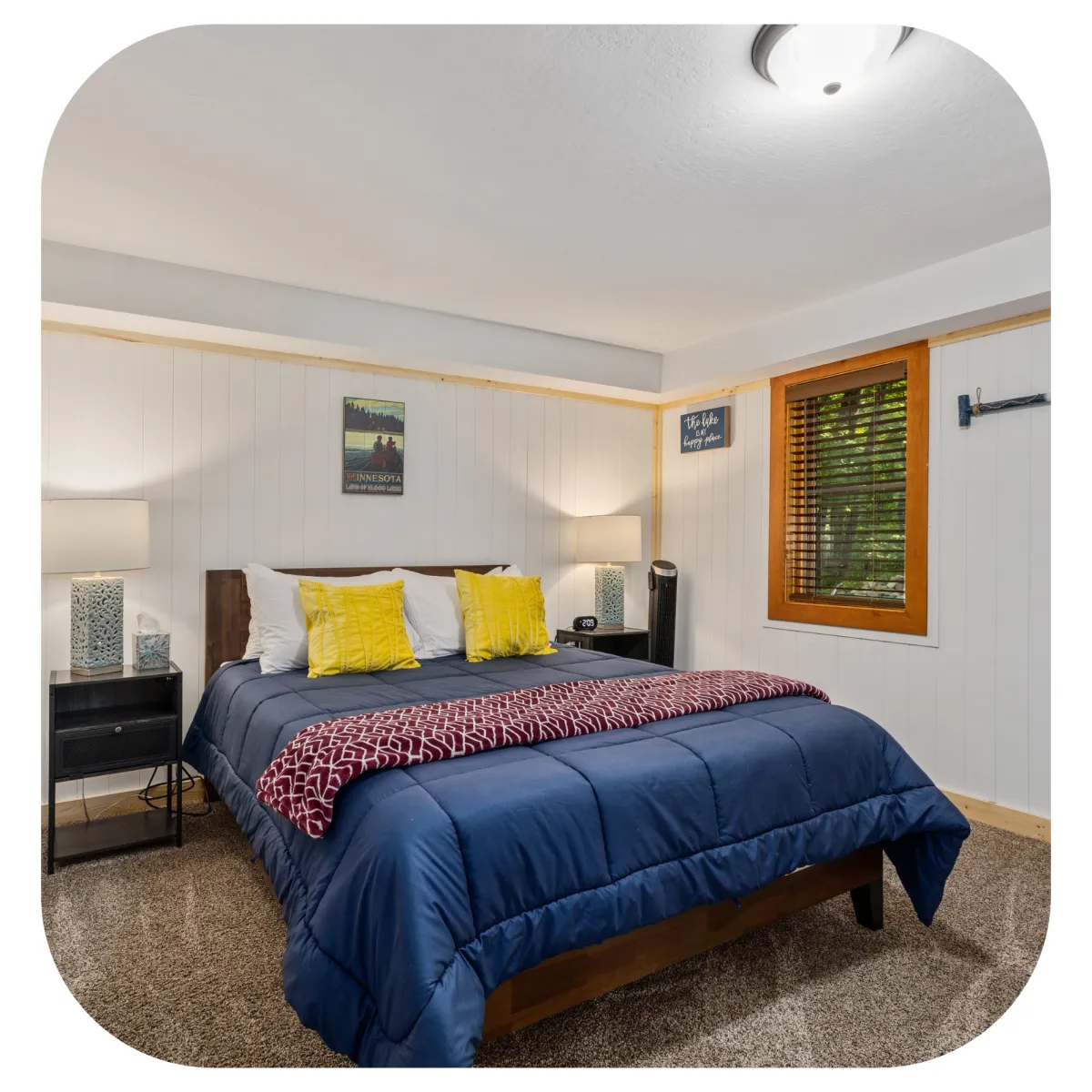 Lower level lakeside bedroom with queen-sized bed and views of the lake, and a closet.