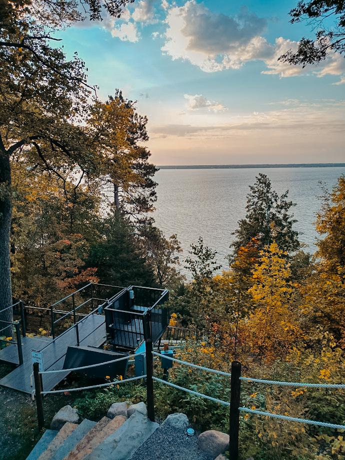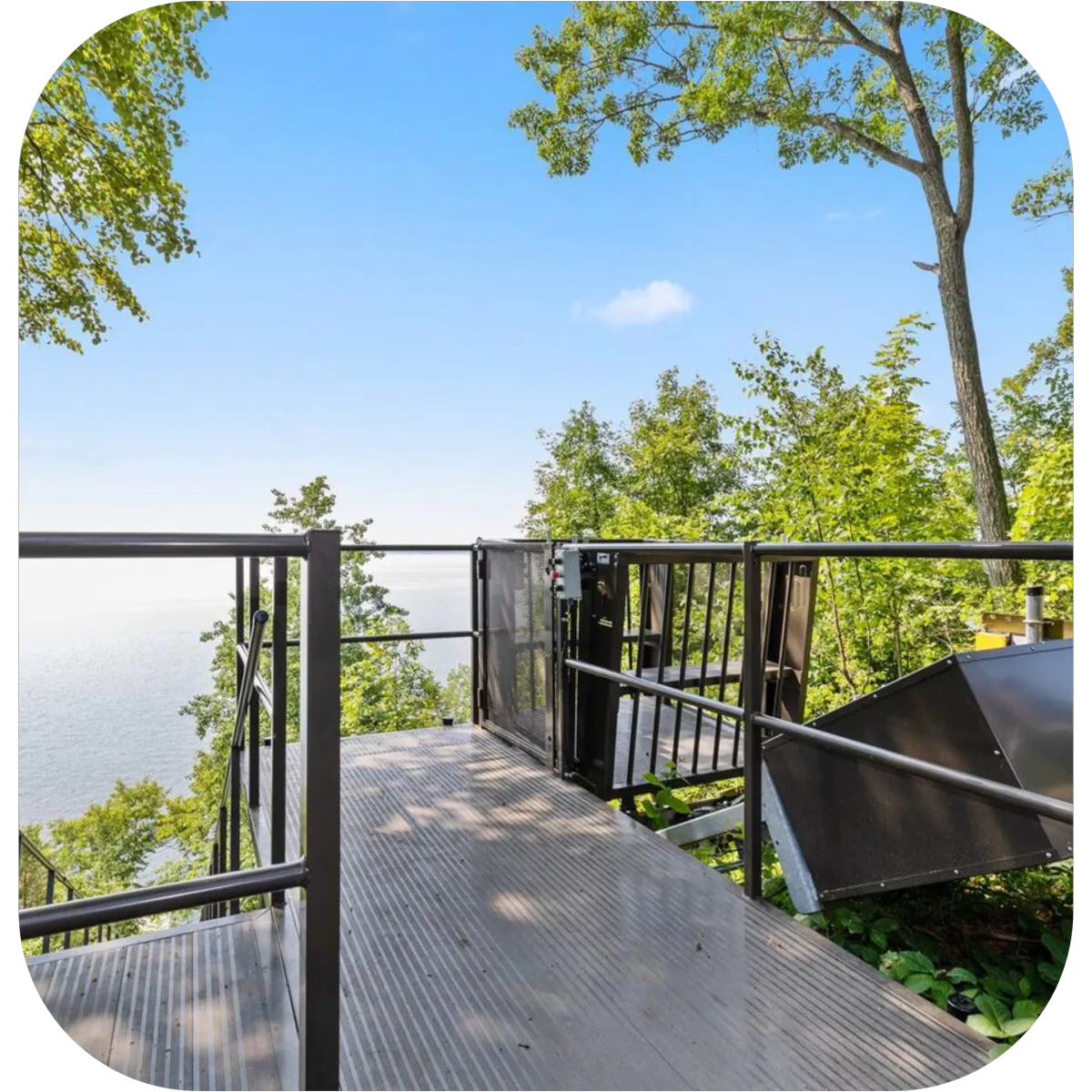 Hillside elevator takes 4 people down at a time from the house to the lakefront. Stairs run parallel to the tram as well.