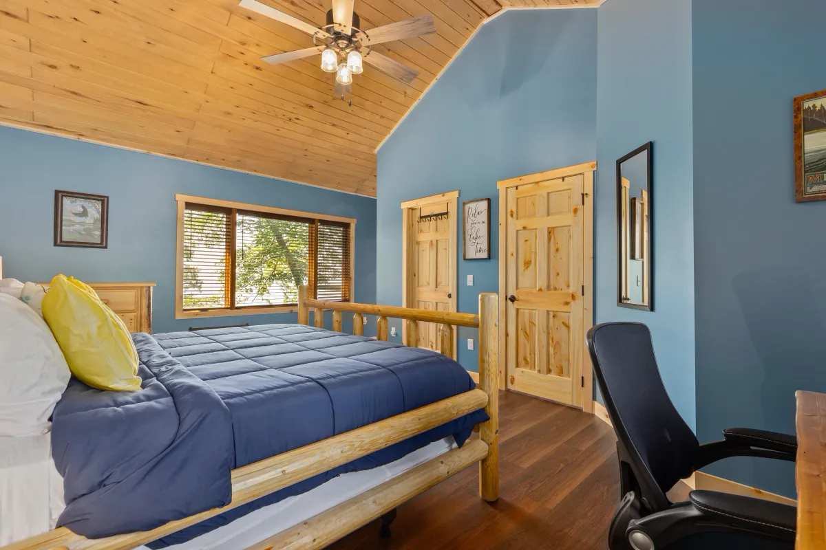 Master bedroom suite on the main level with large walk-in closet and master bathroom along with a king-sized bed. Wake up to beautiful Gull Lake sunrises out your bedroom window.